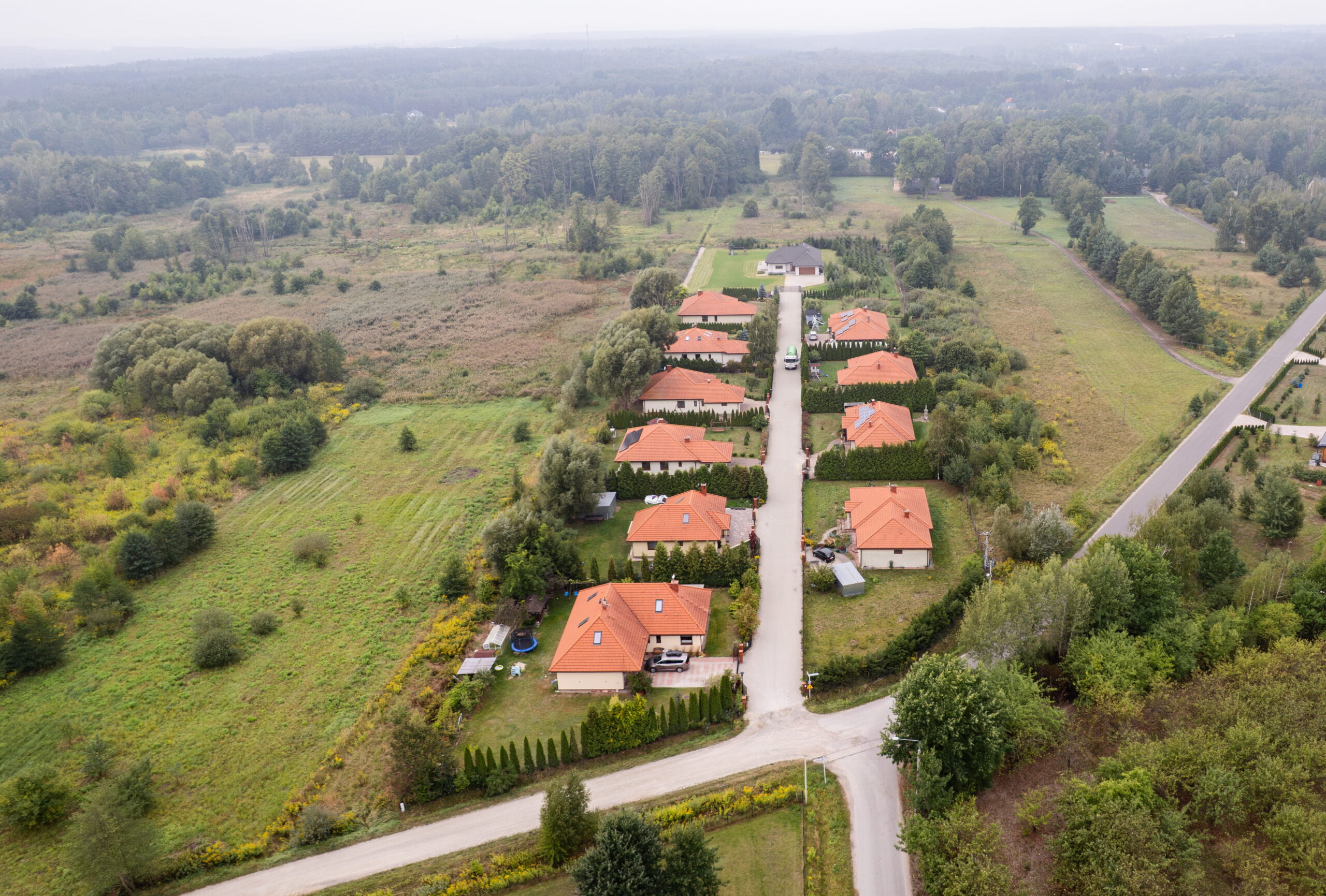 - Parter to strefa dzienna: przestronny salon z kominkiem, praktyczna kuchnia ze spiżarnią, gabinet oraz pomieszczenie gospodarcze z bezpośrednim dostępem z garażu.
